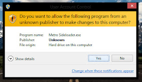 - Setelah proses download selesai, jalankan aplikasi Metro Sideloader dengan administrator priviledge (klik-kanan pada aplikasi Metro Sideloader > klik Run as Administrator [jika membutuhkan izin akses dari User Account Control, klik Yes])
